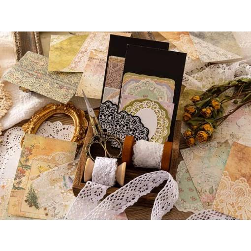 A csomag 30 darab dekoratív csipkés vintage lapot tartalmaz.