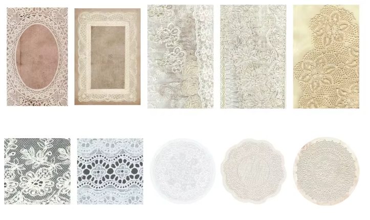 • Stílus: vintage, csipkés minták, finom textúrák, amelyek romantikus, nosztalgikus projektekhez ideálisak.
