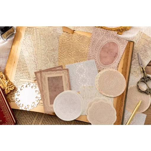Mélyedj bele a vintage scrapbook varázslatos világába ezzel a 30 darab csipkés dekoratív papírból álló készlettel! Minden lap gondosan megtervezett, hogy romantikus hangulatot csempésszen a projektjeidbe — ideális háttérnek, kivágásnak vagy dísznek naplókhoz, albumban, képeslapokhoz vagy bármilyen kreatív munkához.