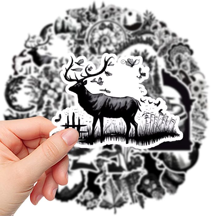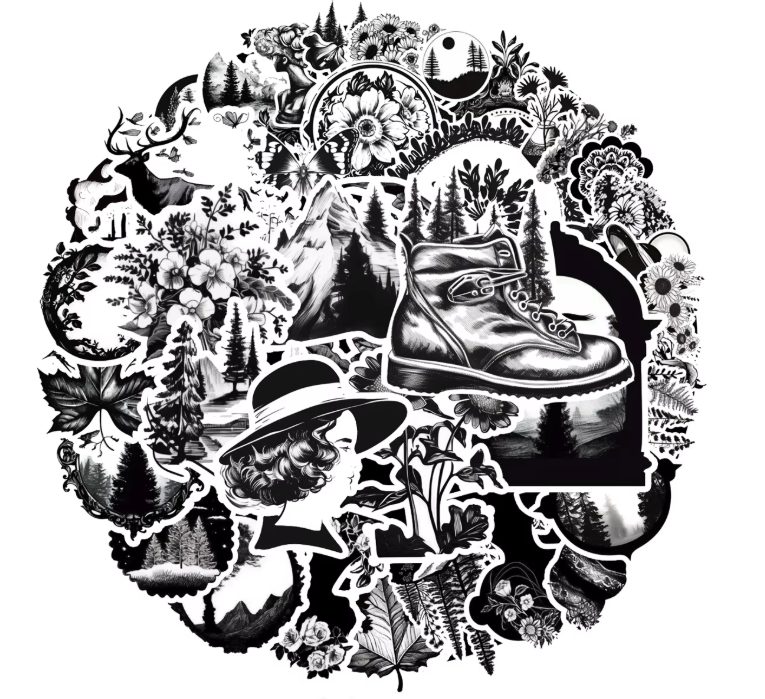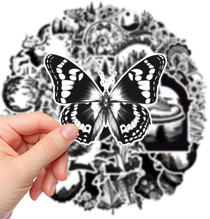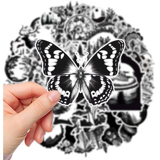 Egyedi készlet 50 fekete-fehér matricából, amelyek egyedi megjelenést adnak a dolgaidnak. A matricák tartós PVC-ből készültek, vízállóak, és könnyen ragaszthatók és eltávolíthatók nyomok nélkül.