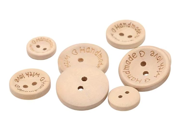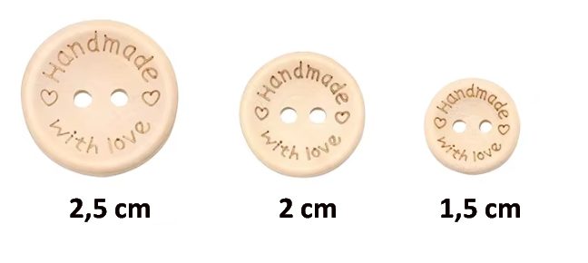 Anyag – természetes fa: A gombok természetes fából készültek festékek nélküli, finom textúrával és diszkrét khaki árnyalattal. Ez az anyag rusztikus, meleg és organikus megjelenést ad a projektjeinek.
