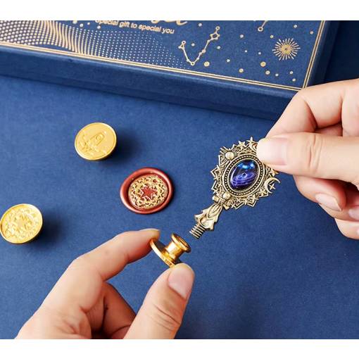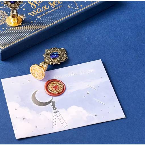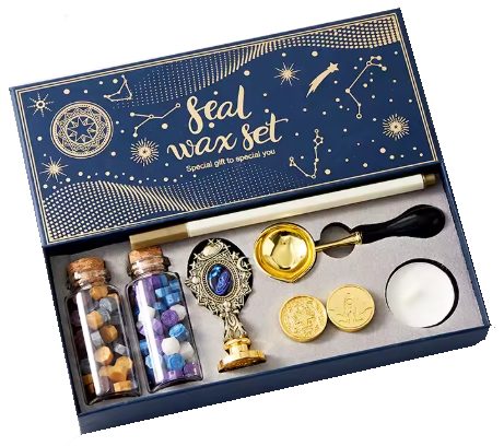 Ez a gyönyörű pecsétkészlet kék dobozban csillagmintával mindent tartalmaz, amire szükséged van az eredeti pecsétek készítéséhez.