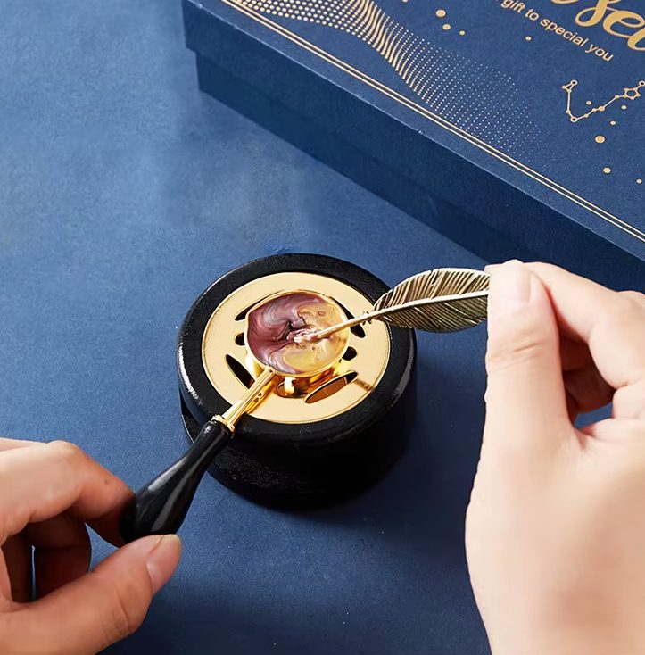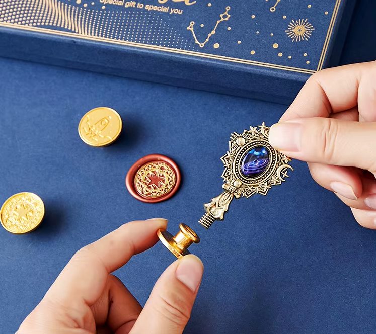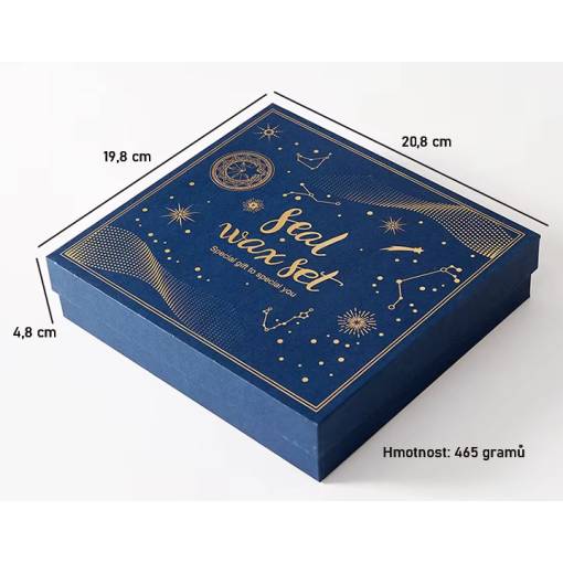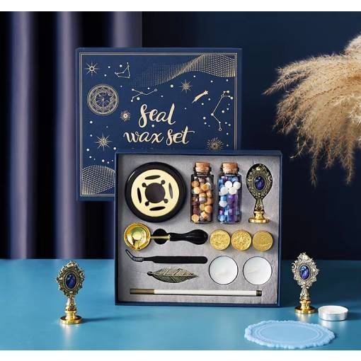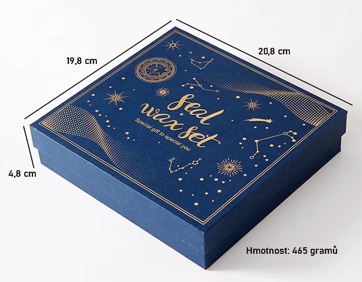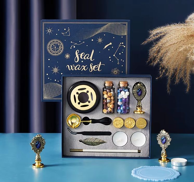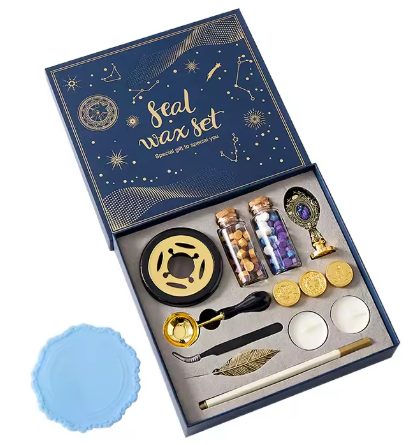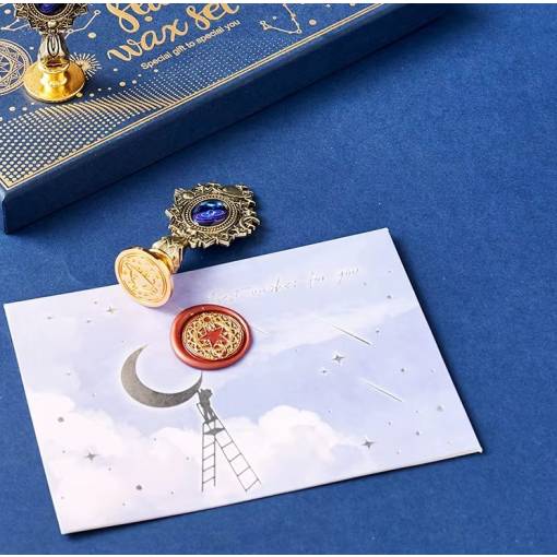 Ez a gyönyörű viaszpecsételő készlet kék dobozban, csillagmotívummal mindent tartalmaz, amire szükséged van az eredeti pecsétek készítéséhez.