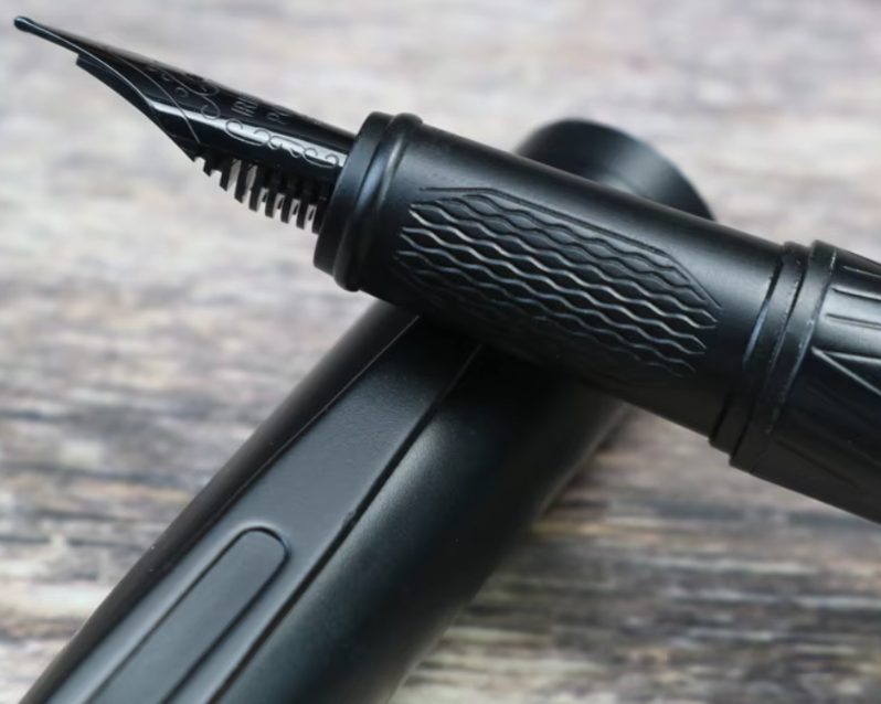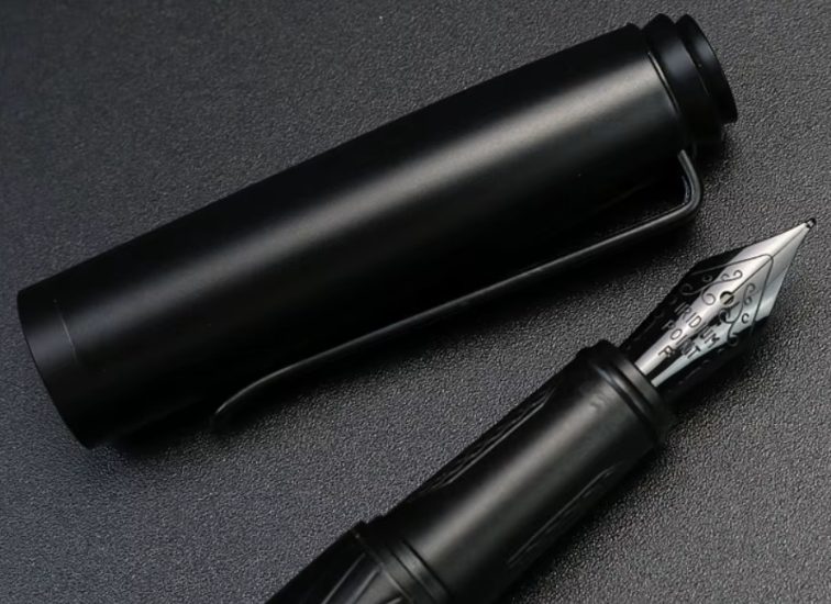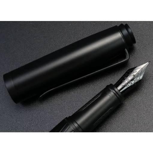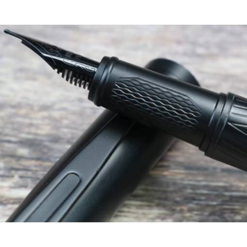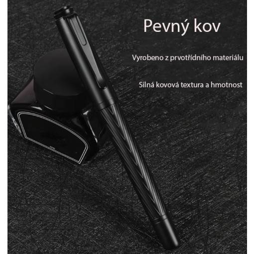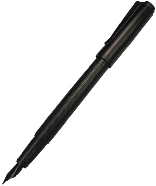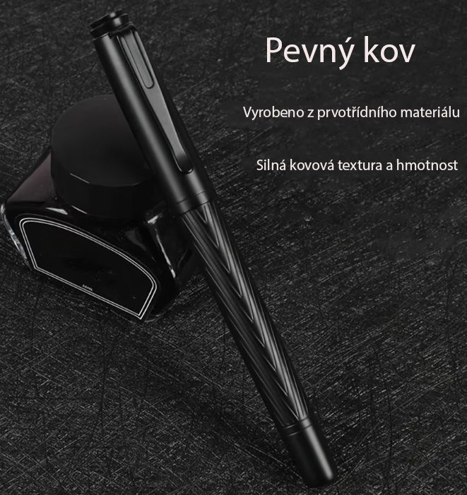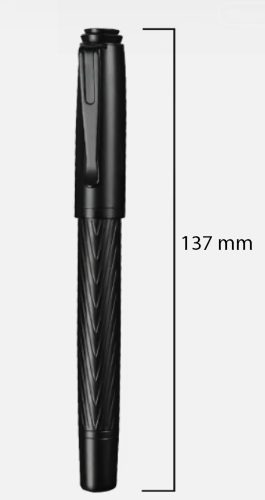 A fém töltőtoll stílusos, időtlen megjelenést ötvöz a praktikus funkciókkal. A toll teste diszkrét „fás” textúrával rendelkezik, a fekete kivitel klasszikus eleganciát kölcsönöz a pergamen hatásnak.