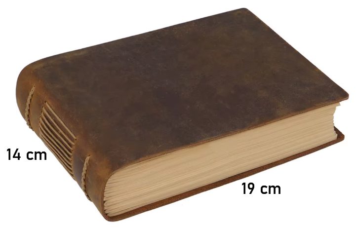 A csomag egy bőr borítóval rendelkező széles naplót tartalmaz.