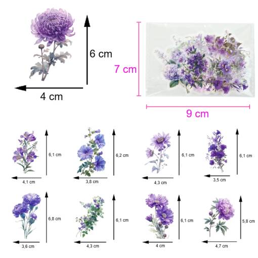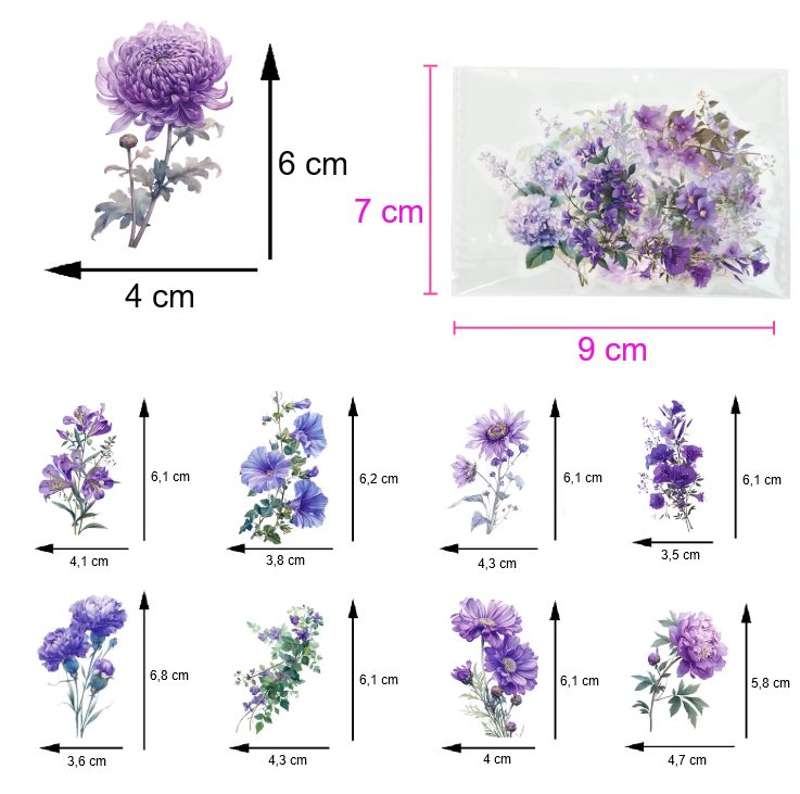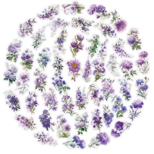 Adjunk érzékeny és romantikus hangulatot kreatív projektjeidnek ezzel a 50 darab átlátszó lila virágos matricát tartalmazó készlettel. </p>